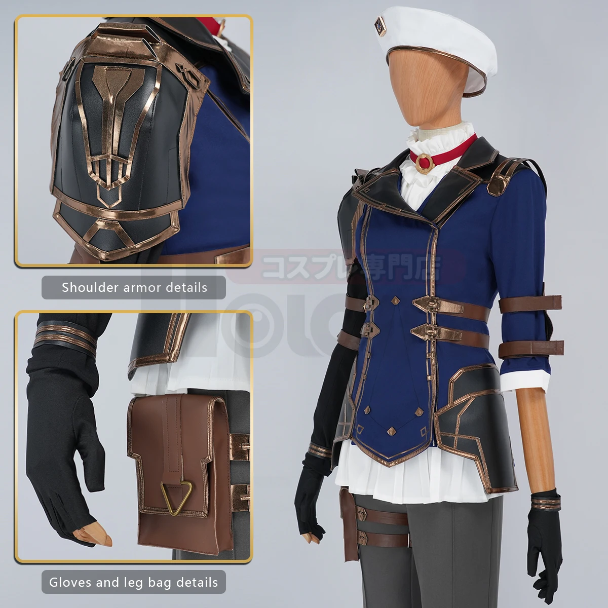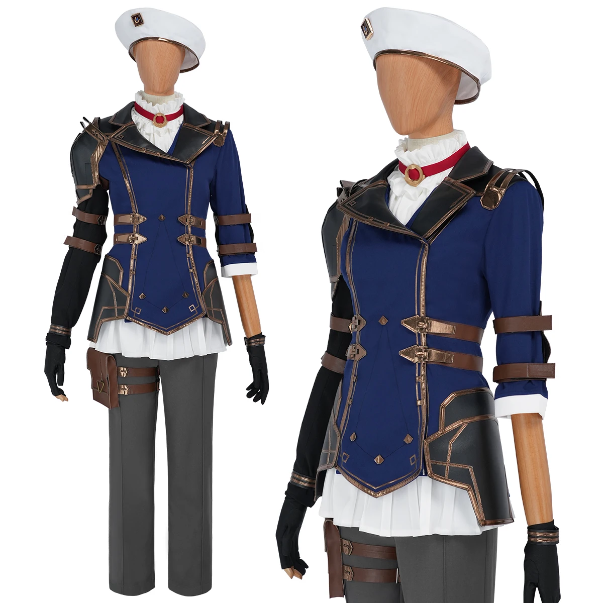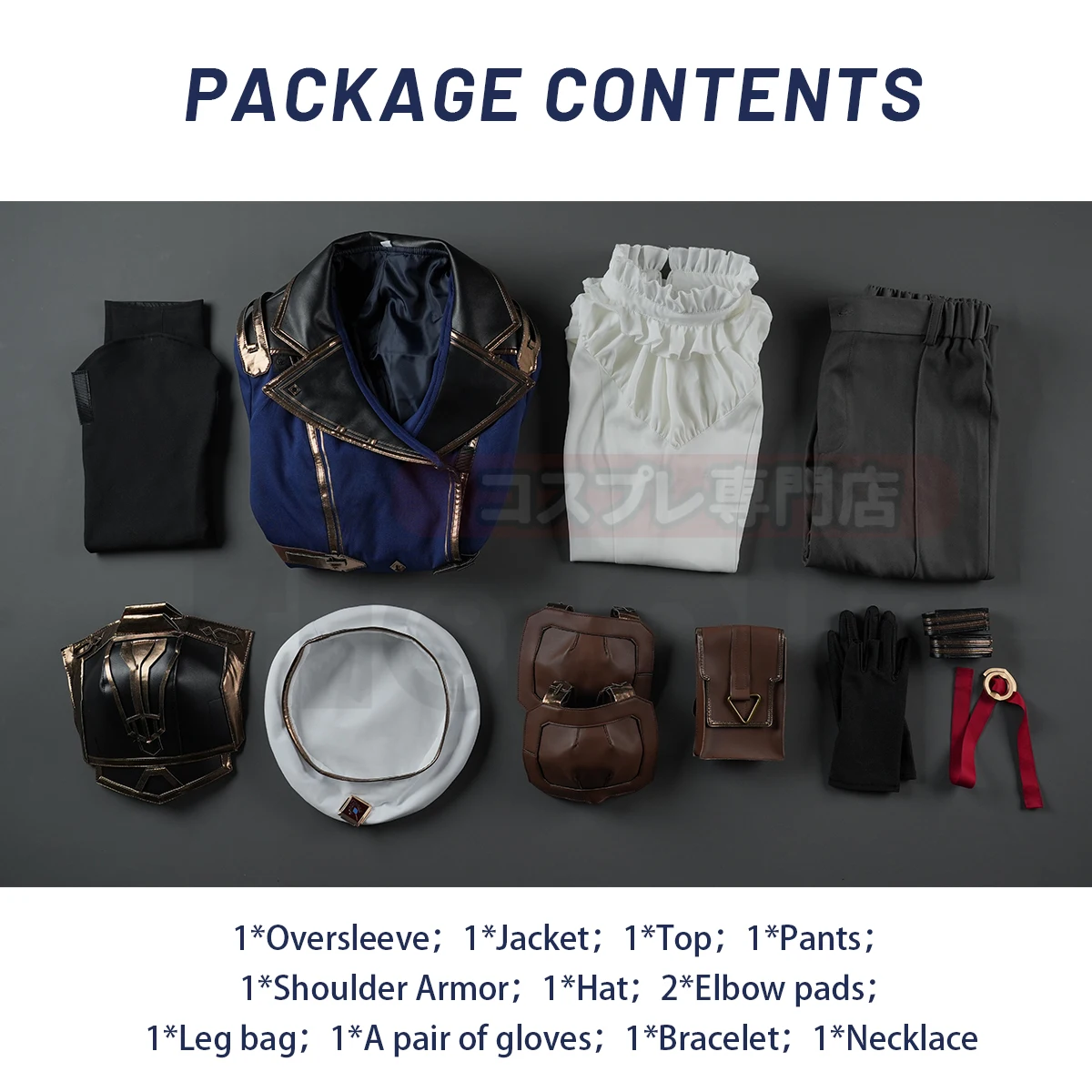 Costume only : 1*Oversleeve; 1*Jacket; 1*Top;1*Pants;1*Shoulder Armor; 1*Hat; 2*Elbow pads,1*Leg bag; 1*A pair of gloves; 1*Bracelet; 1*Necklace