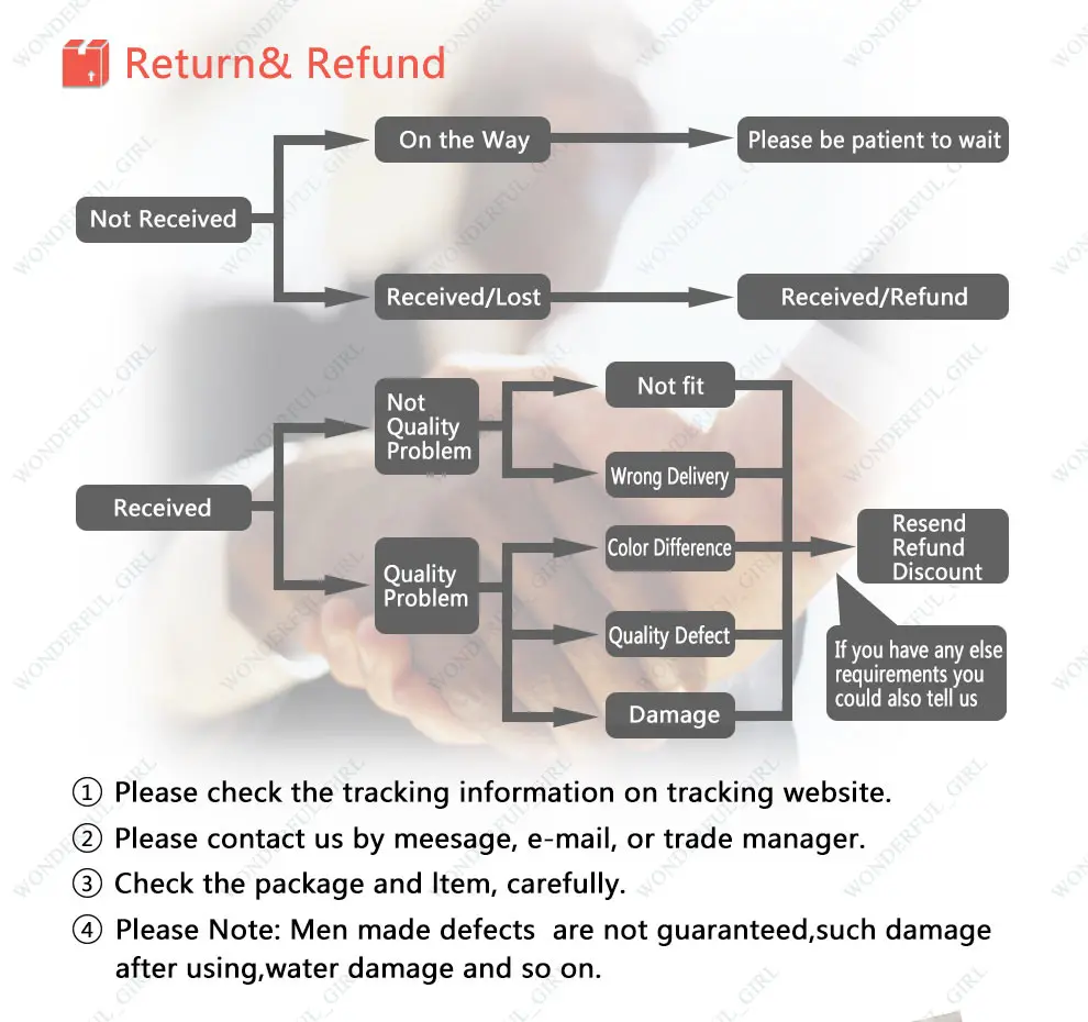 • If you did not receive the product within the guaranteed time( 45 days not including 2-5 day processing) you can request a refund or a reshipment.